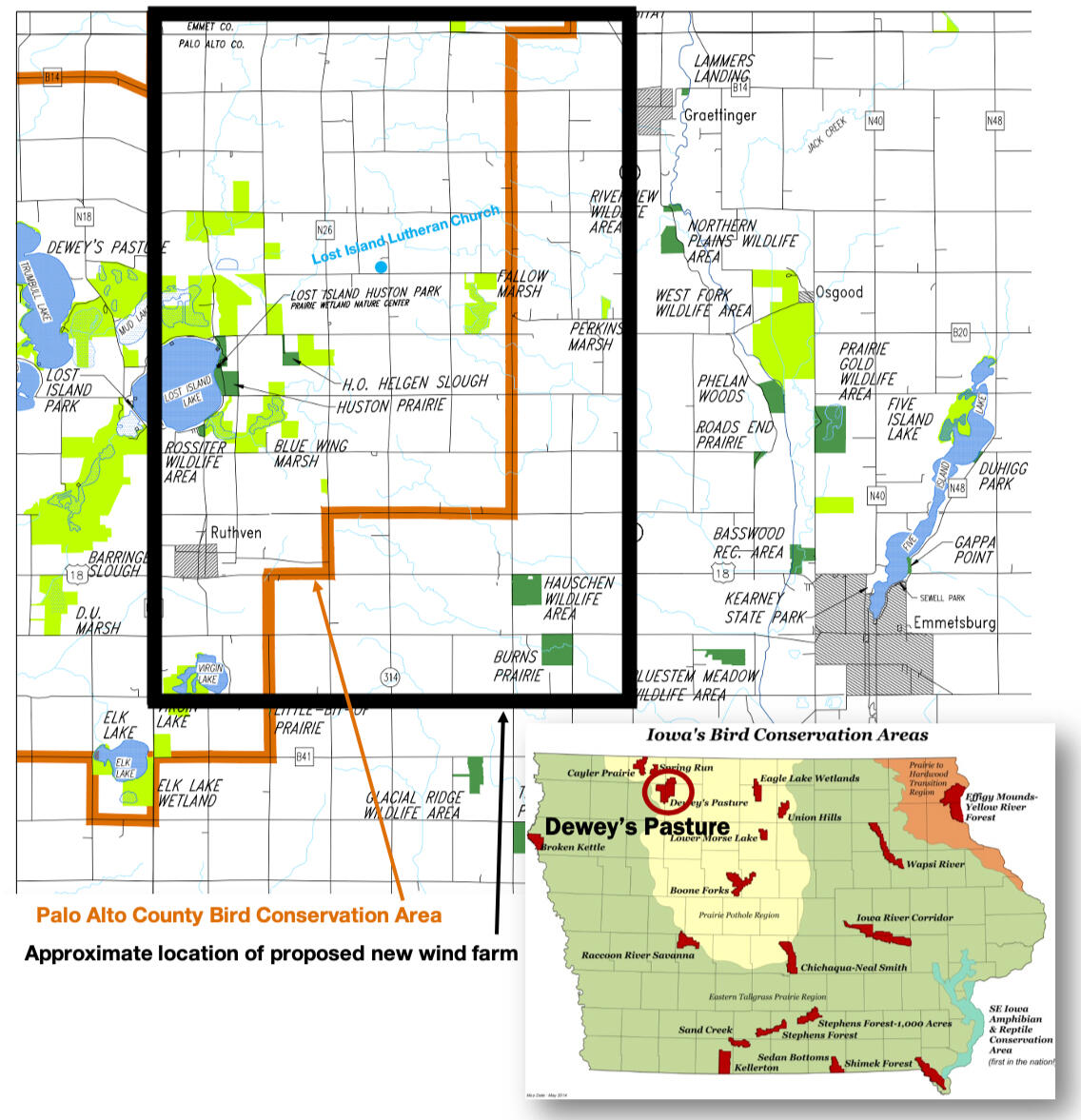 Vestas Wind and their subsidiary Steelhead Americas are quietly luring Lost Island farm families (some of whom live in Dewey’s Pasture BCA) to sign over control of their land and legacy in the creation of a new 40-50 turbine industrial wind operation.Rich, foreign-owned companies are trying to grab part of the farmer’s way of life. Again. Will our county leadership let these corporate outsiders pay off a few…but take what they want from the rest of us? Our fertile farmland? Beautiful sunsets and starry night skies? Pristine Lost Island Lake and Lost Island Nature Center? Thousands of acres of hunting preserves? Our 79,000 acre “Dewey’s Pasture” Bird Conservation Area (BCA)? Did you know Palo Alto County is home to one of only 24 Bird Conservation Areas in Iowa? Dewey’s Pasture BCA consists of farmland, wetlands and marshes, Lost Island Lake, Lost Island Nature Center and thousands of acres of prime hunting ground. Check the map (above)—your farm or neighbor’s farm may be located in “Dewey’s Pasture.” Wonder why you’ve seen bald eagles or swarms of migrating birds on your farm? Now you know!Turbines would be a “death trap” for wildlife our County has spent hundreds of thousands of dollars protecting—through countless DNR initiatives.HOW MASSIVE? Some Vestas industrial wind towers are about the height of the IDS Tower (792 ft), the really tall building in Minneapolis. Taller than the Gateway Arch (630 ft) in St. Louis. Taller than the Space Needle (605 ft) in Seattle. Taller than the tallest building in Iowa—801 Grand Building in Des Moines at 630 ft.