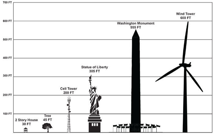 — 600 ft tall towers will cast shadows over 1/4 mile and beam blinking red strobe lights for 20 miles.